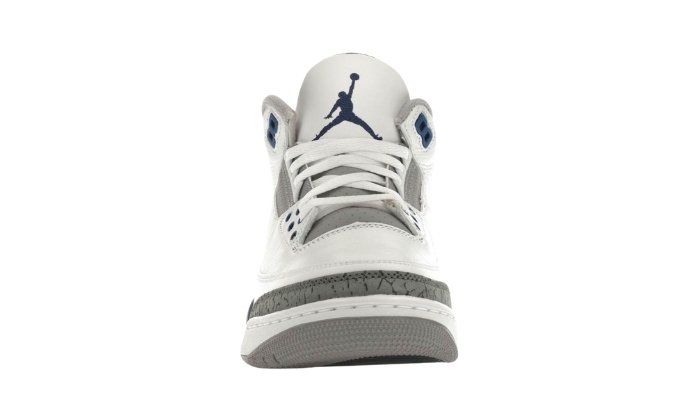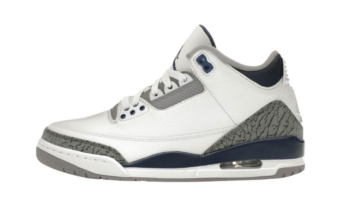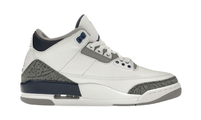 Le Jordan 3 Retro blu mezzanotte sfoggiano una disposizione dei colori ispirata al design originale, evocando ricordi dell’iconica colorway “bianco grigio cemento” introdotta nel 1988.