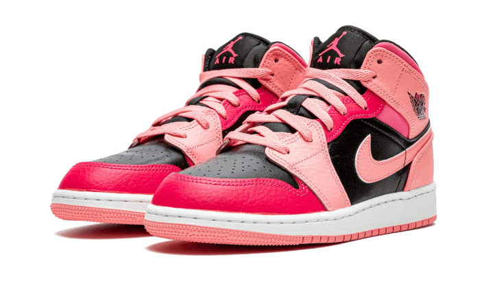 Lร Air Jordan 1 Mid Gesso di corallo Pink Indossa una base in pelle nera su cui troviamo la sovrapposizione dei pannelli rose e Fuschia. Il salto sulla lingua prende anche una tonalitร rose Per essere d’accordo con il resto della scarpa.