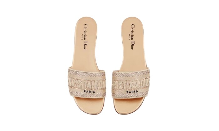 Lโ€™iconico sandalo Dway รจ una creazione intramontabile. Il modello รจ proposto in unโ€™elegante interpretazione realizzata in cotone ricamato con filo metallizzato e impreziosito da strass color oro. La tomaia ricamata presenta lโ€™inconfondibile firma Christian Dior Paris, che salta immediatamente allโ€™occhio. Completato da una soletta in pelle di capra laminata tono su tono, donerร  un tocco di eleganza a qualsiasi outfit.