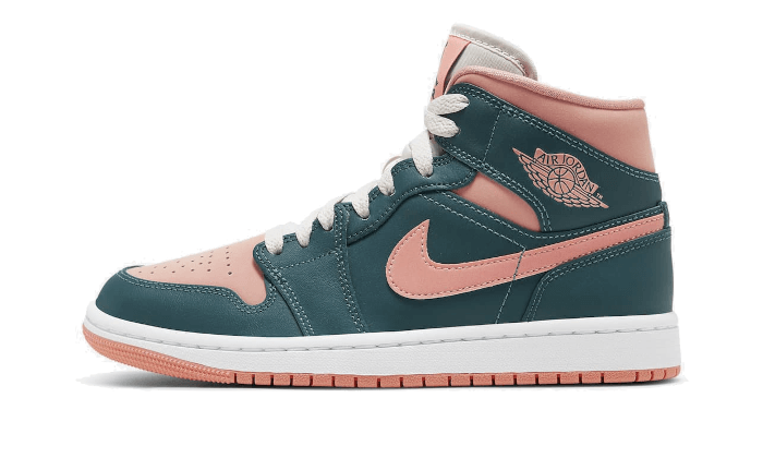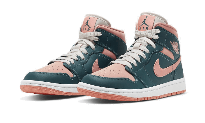 Lร Air Jordan 1 Mid Buio Teal Green presenta una base in Pelle blu anatra ai vari pannelli di pelle rose come la toebox, il col e lo swoosh laterale. Una lingua beige รจ sollevato da Lacci bianchi rotti. Un’intersuola bianca con la suola rose lo finisce design tendenza.