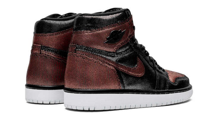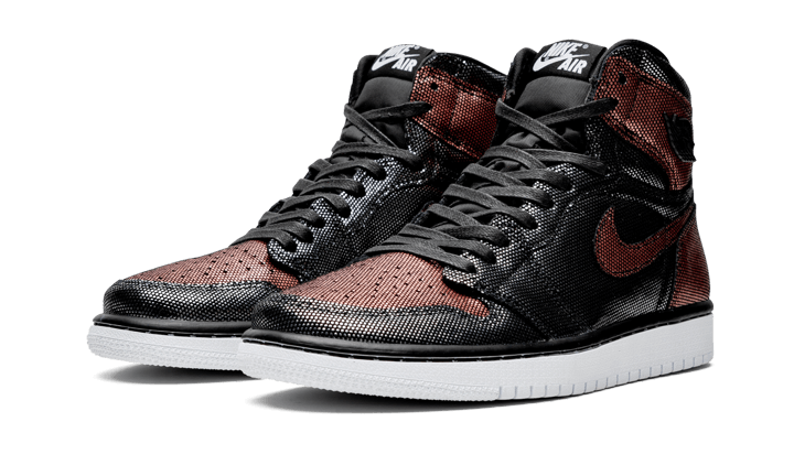 Il Air Jordan 1 Retro High Fearless Metallic Rose Gold un modello da donna presentato in una finitura a rete metallica che combina il nero e il rosso. Presenta il logo Wings sulla caviglia e lacci cerati neri. Il tocco finale una suola bicolore.