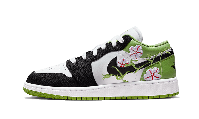 Lร Air Jordan 1 Low Viti floreali rivelare una base in pelle bianca accompagnato da sovrapposizioni nere e verdi dotate di a Finitura in stile Ballon basketball. Un altro tocco di originalitร รจ dato da a ricamo floreale chi veste il Swoosh lato del viso esterno.