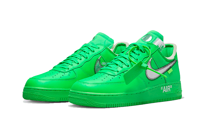 Lร Nike Air Force 1 Low Off-White Leggero Green Scintilla indossa una base in Pelle verde fluente che copre l’intera struttura. La sua scheda in schiuma รจ perforata come il Dunk Off-White. I pannelli laterali sono adornati con a Argento swoosh con finitura leggermente crepita. Diverse cuciture nere arrivano per circondare il marchio non strutturato Fluo Green Tag. Iscrizione “AIR” Blanche adorna la suola monocromatica e segna la firma industriale del designer deceduto.