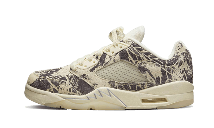 La Air Jordan 5 Low Expression si presenta con una base in scamosciato beige, accompagnata da una stampa grigio scuro su tutta la superficie. I lacci e una gabbia in TPU si abbinano alla tonalitร beige della base, mentre la suola ne riprende le sfumature. Un bordo grigio sulla suola intermedia disegna i contorni del celebre dente di squalo, caratteristica di questo modello fin dalla sua uscita nel 1990.