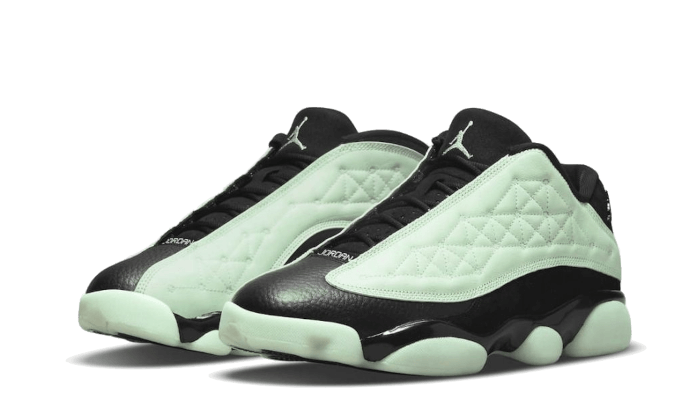La Air Jordan 13 Low Singles’ Day prรฉsente une base en cuir grainรฉ noir matelassรฉ vert clair qui affiche un quadrillage gรฉomรฉtrique. Ce dernier se pare dโinscriptions Glow In The Dark au style binaire qui s’accordent avec la semelle noire et vert phosphorescent. Une semelle intรฉrieure aux motifs rappelant les puces รฉlectroniques vient parachever le design de Tinker Hatfield.