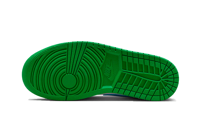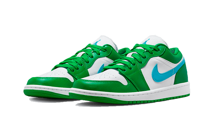 QuestaAir Jordan 1 Low Lucky Green Aquatone presenta una base in pelle bianca, accompagnato da sovrapposizioni in pelle verde e un tocco di pelle blu Allo swoosh e al logo delle ali ricamato sul tallone.