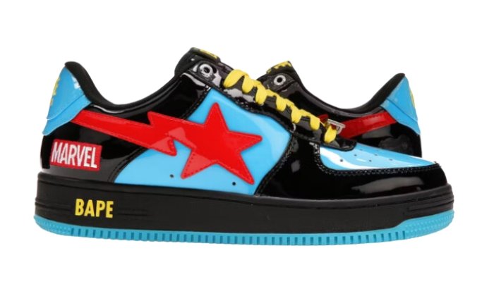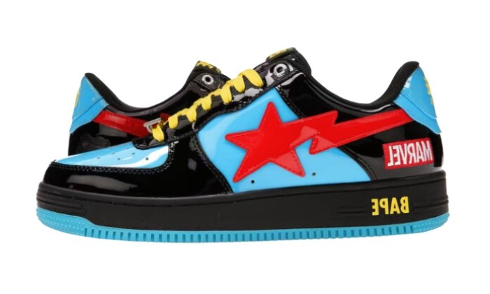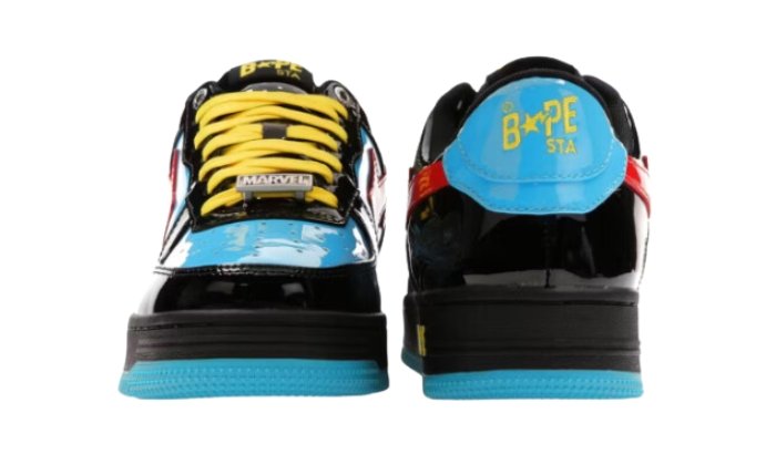 La A Bathing Ape Bape Sta Marvel Comics Black Widow (2022), dedicata a Black Widow, rende omaggio allo status iconico del personaggio incorporando la sua distintiva combinazione di colori blu con sovrapposizioni nere. La sneaker mostra audacemente il logo BAPA STA in rosso sia sul lato mediale che laterale, con accenti di giallo che impreziosiscono i lacci, il logo sul tallone e lโ€™emblema dellโ€™intersuola. Invece di una normale scatola da scarpe, questa scarpa รจ confezionata in un esclusivo โ€œblister caseโ€. Sottolineando la sua associazione Marvel, la scarpa รจ impreziosita dal ricamo del personaggio e del logo Marvel sul lato del tallone. Inoltre, la soletta presenta unโ€™arte dei fumetti che ricorda il cartone di un blister, mentre i lacci Marvel deubrรฉs aggiungono un tocco distintivo alla scarpa