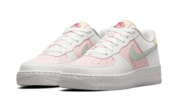 La Nike Air Force 1 Low Next Nature Easter presenta una base in pelle rosa con sovrapposizioni in pelle bianca sugli occhielli, sul parafango e sul pannello dei quarti. Uno swoosh verde giada adorna i pannelli e una linguetta giallo limone sul tallone. L’intera scarpa poggia su una suola speckle realizzata con starting atmateriali riciclati.