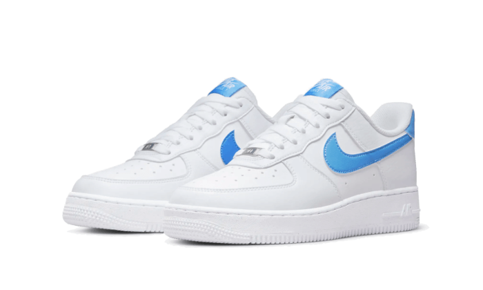 Il Air Force 1 Low Next Nature University Blue presenta la tradizionale basein pelle bianca con uno swoosh in pelle blu cielo e un heeltab. Il marchio bicolore sulla linguetta completato da un’allacciatura cromata. L’intera scarpa impostata su una suola bianca con tecnologia Air.