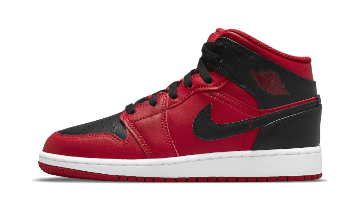 IL Air Jordan 1 Mid Inversione Bred รจ adornato con una parte superiore pelle rossa Ai pannelli neri sul toebox, il tallone e la silhouette Col de la. Il logo Jordan Ali rosso e il Black Swoosh Vieni a portare Contasse al modello del 1985. Il tutto poggia su una suola bianca e una suola concessa alla tomaia.