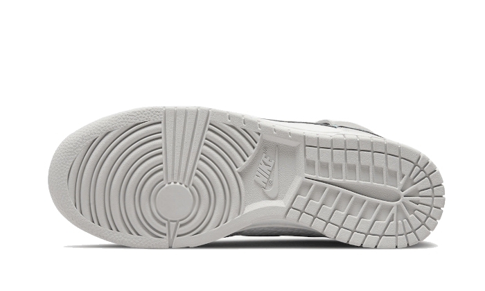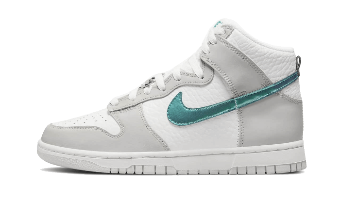 La Nike Dunk High Ring Blingaff presentauna tomaia in pelle bianca testurizzata delicatamente accentata con sovrapposizioni di pelle grigia. La nuova silhouette presenta uno Swoosh metallicoverde turchese che abbraccia i pannelli e la linguetta del tallone. Uno swoosh argentato circondato da un anello si trova in cima ai lacci e perfeziona il design iconico di Peter Moore.