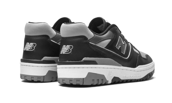 Il New Balance 550 Shadow presenta una base in pellenera con alcuni dettagli grigi sul toebox e sul colletto della coppia. Il design rifinito con alcuni tocchi di bianco, qui sui marchi e sull’intersuola.