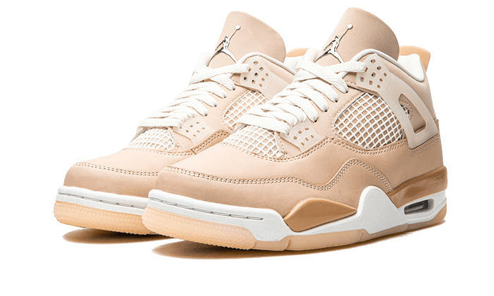 Le Air Jordan 4 Shimmer presentano una tomaia che oscilla tra tonalitร beige e rosa pallido. Ci sono diversi richiami arancioni vicino allโintersuola e al tallone. Troviamo il consueto Empiรจcement leggermente traslucido abbinato a una gabbia laterale a rete. Un Jumpman sulla linguetta completa il tutto.