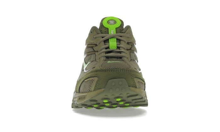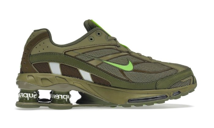 Le Nike Shox Ride 2 Supreme Neutral Olive Electric Green sono caratterizzate da una tomaia in mesh color verde chiaro con sovrapposizioni in pelle e camoscio color verde scuro, Swoosh verde elettrico e rivestimenti in tessuto. Le linguette e le fodere del calzino DURAPLUSH aggiungono il massimo comfort per l’uso quotidiano. Sotto il tallone, le unitร  Nike Shox color verde con il marchio Supreme completano il capolavoro.