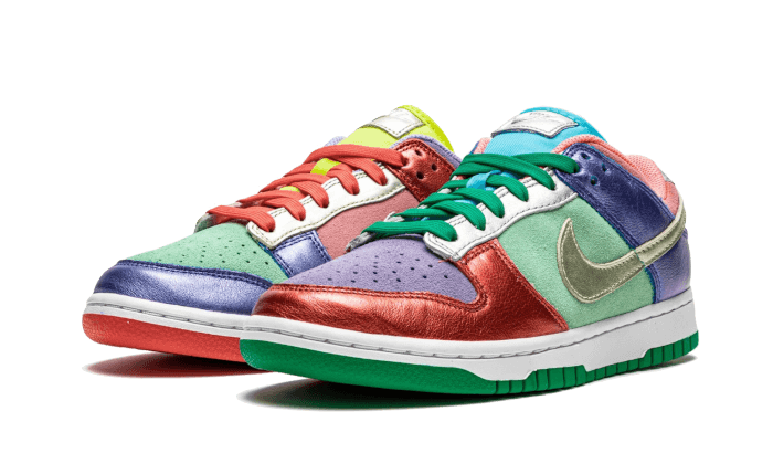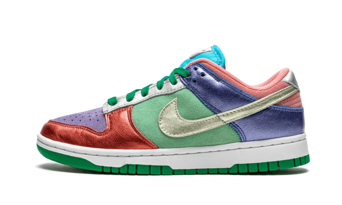 Lร Nike Dunk Low Sunset Impulso Visualizza una struttura in Pelle di brevetto E Svezia. Lร low-Top indossa un aspetto non corrispondente che mescola toni vivaci di viola, rosso, rose, GIALLO E Verde Intorno a Swoosh a volte argento a volte dorato. Una dispensa bianco e a suola Il verde viene a tempera design Di Peter Moore.