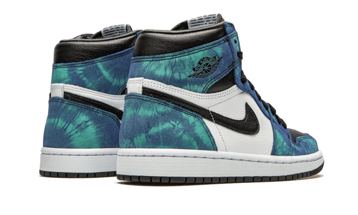 La Air Jordan 1 Retro High Tie-Dye ha una base in pelle con il bianco sul pannello dei quarti e il nero sul toebox e sul collare della caviglia. Sulla tomaia sono applicati degli inserti in pelle scamosciata con il famoso effetto Tie-Dye qui in turchese e blu medio. Gli elementi classici del design sono rifiniti con una semplice allacciatura, lo Swoosh, la linguetta nera e la suola bicolore.