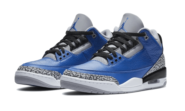 L’Air Jordan 3 Varsity Royal presenta una base in pelle blu royal arricchita dal leggendario Elephant Print sulla punta e sul tallone. Fedeli al design del modello originale, questa versione inedita รจ priva dello swoosh laterale. Elementi neri posizionati sulla suola e sul retro creano un contrasto con la maggior parte del blu apparente. Un empiรจcement in pelle grigia perforata vicino agli occhielli, i lacci neri e il Jumpman, che compongono gli elementi di branding, completano il tutto.