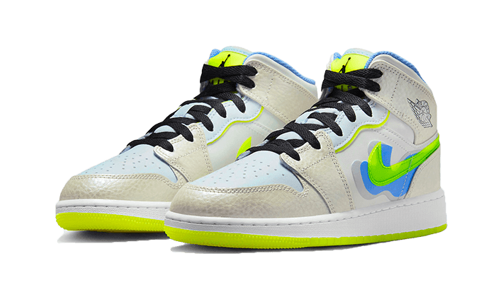 Lร Air Jordan 1 Mid Se deformรฒ Swoosh separato di pannelli in pelle bianca e blu pastello, adornato con sovrapposizioni che sfoggiano uno schema safari. A TPU SWOOSH Fluo Green traslucido Dร per l’etichetta della lingua e la suola. Tutto si basa su una suola colorata con un look originale!