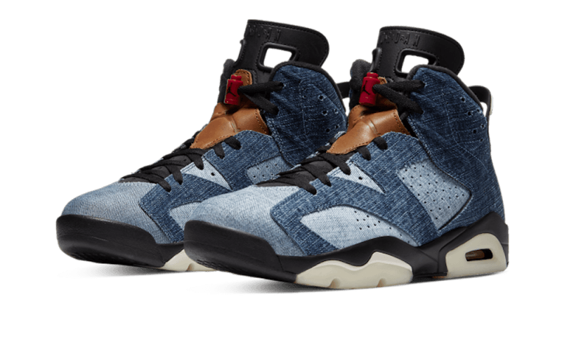La Air Jordan 6 Retro Washed Denim prรฉsente une base constituรฉe dโempiรจcements alternant trois coloris de denim. On retrouve un patch en cuir marron recouvrant une partie des lacets agrรฉmentรฉ dโune languette ajourรฉe, dโun Jumpman au talon et de lacets noirs. Le tout est finalisรฉ par une semelle noire et blanche dotรฉe dโune unitรฉ AIR.