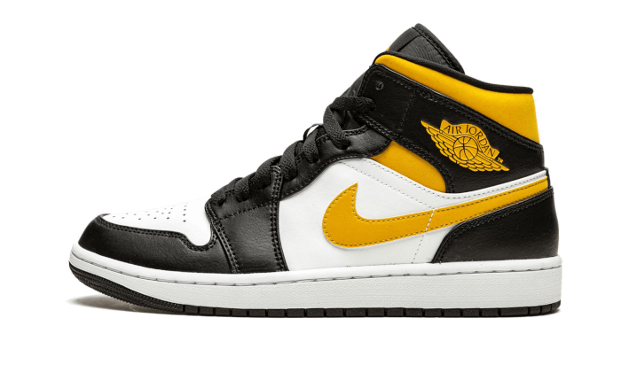 Lร Air Jordan 1 Mid White Polline Black Presenta la classica combinazione bianca e nera sulla maggior parte della coppia. Gli accenti gialli nello swoosh, la caviglia e le ali completano il Blocco colore.